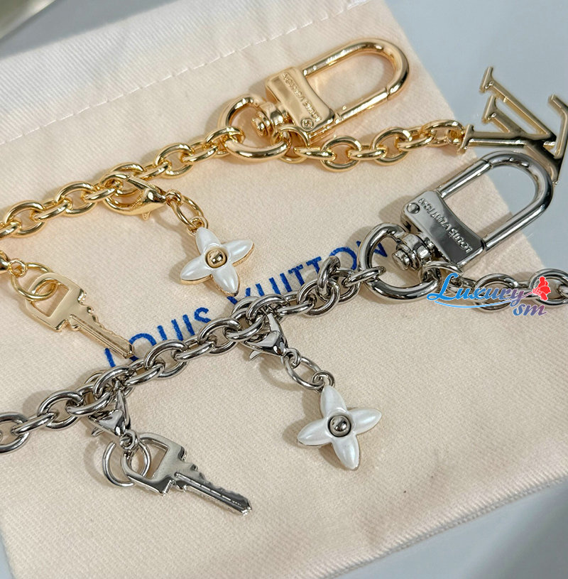 반짝이는 골드 색상 금속 소재의 LV 참 백 참. 둥근 모노그